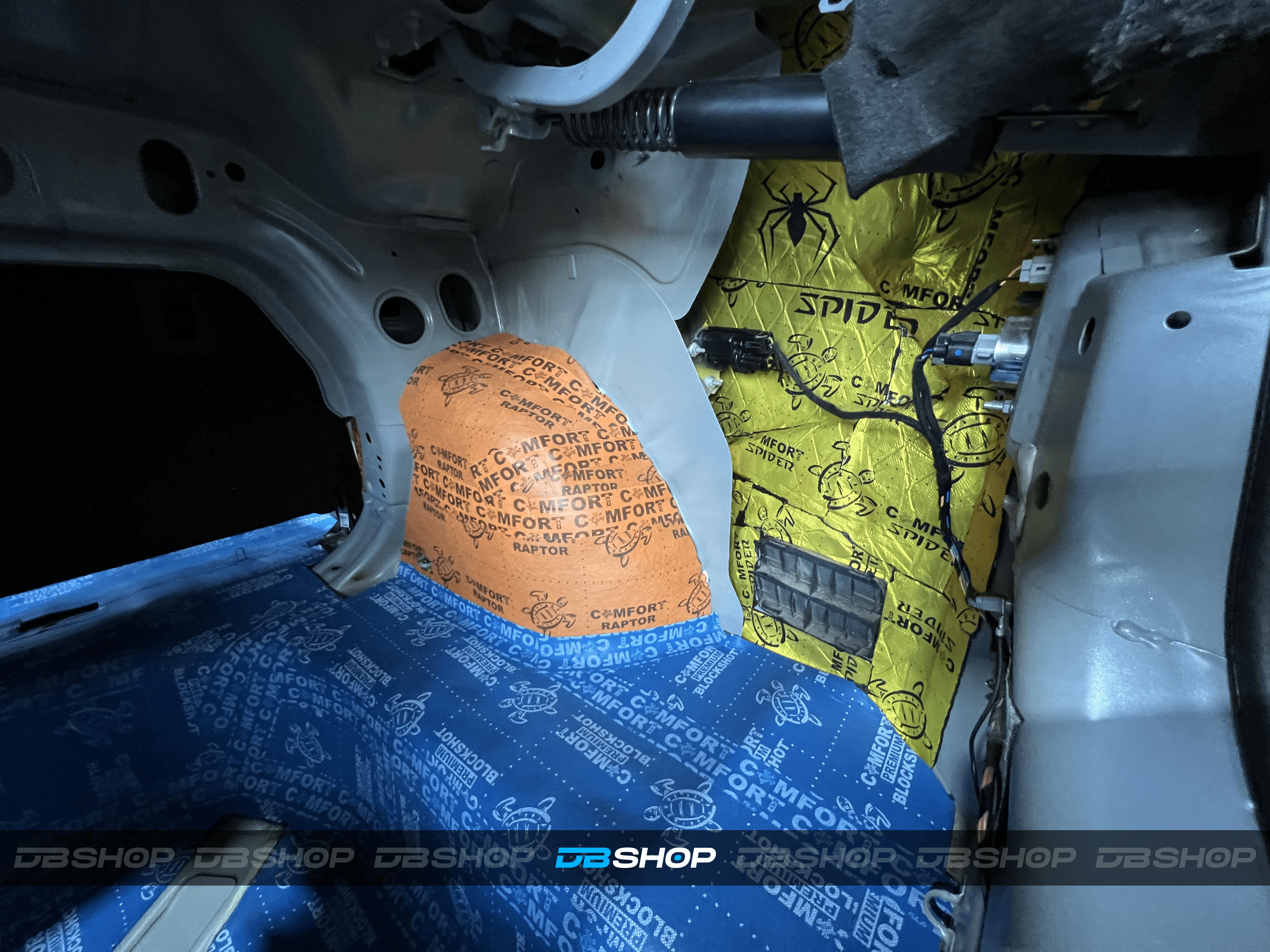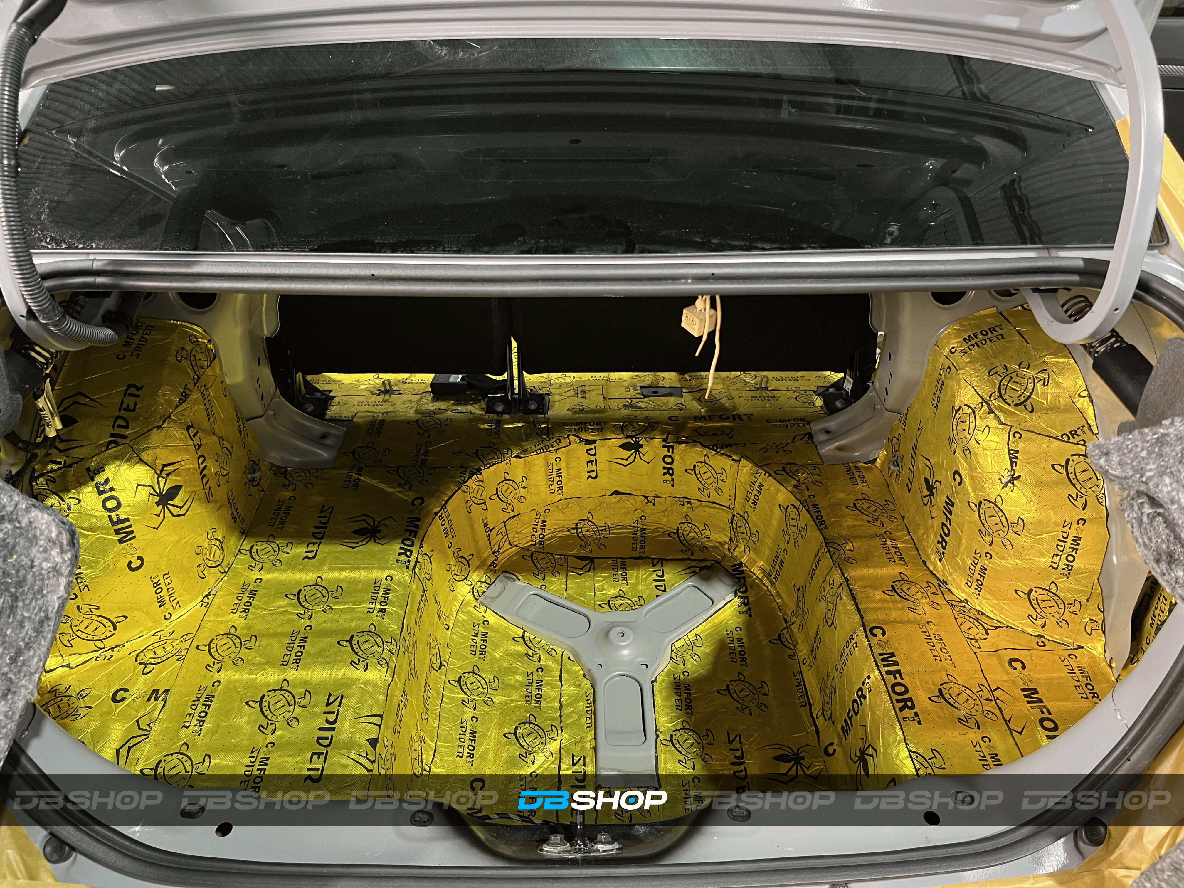 Первым слоем на дно салона и багажник нанесли виброизоляцию Comfort Mat Spider. На снимке виден готовый слой Spider, плотно наклеенный на поверхности, обеспечивающий прочную основу.