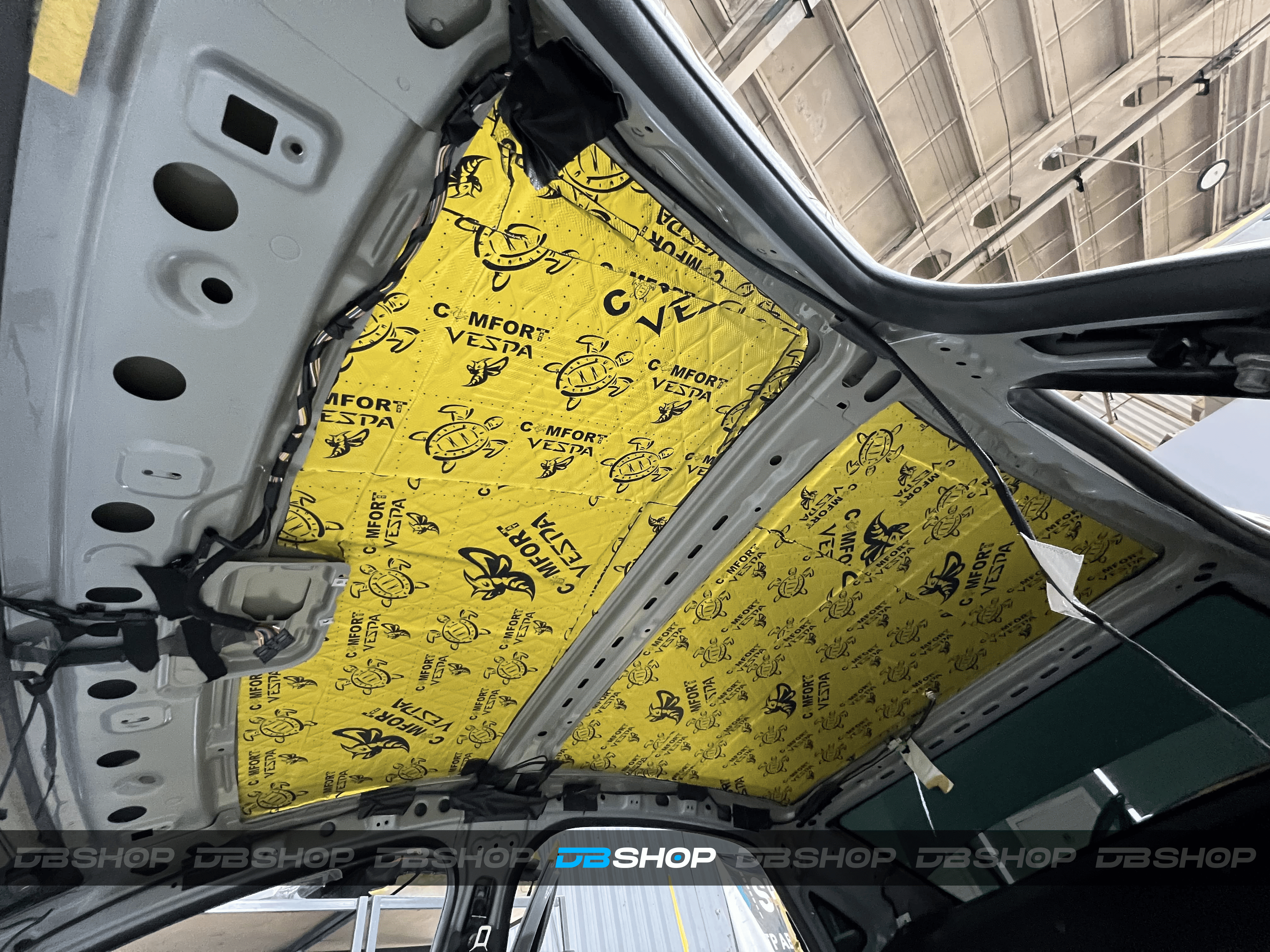 Первым слоем на крышу нанесли виброизоляцию Comfort Mat Vespa. Материал отличается улучшенной адгезией к металлическим поверхностям. Благодаря матовому покрытию фольги обеспечивается хорошее сцепление с шумоизоляционным материалом. Устойчив к воздействию влаги, обладает антикоррозионными свойствами.