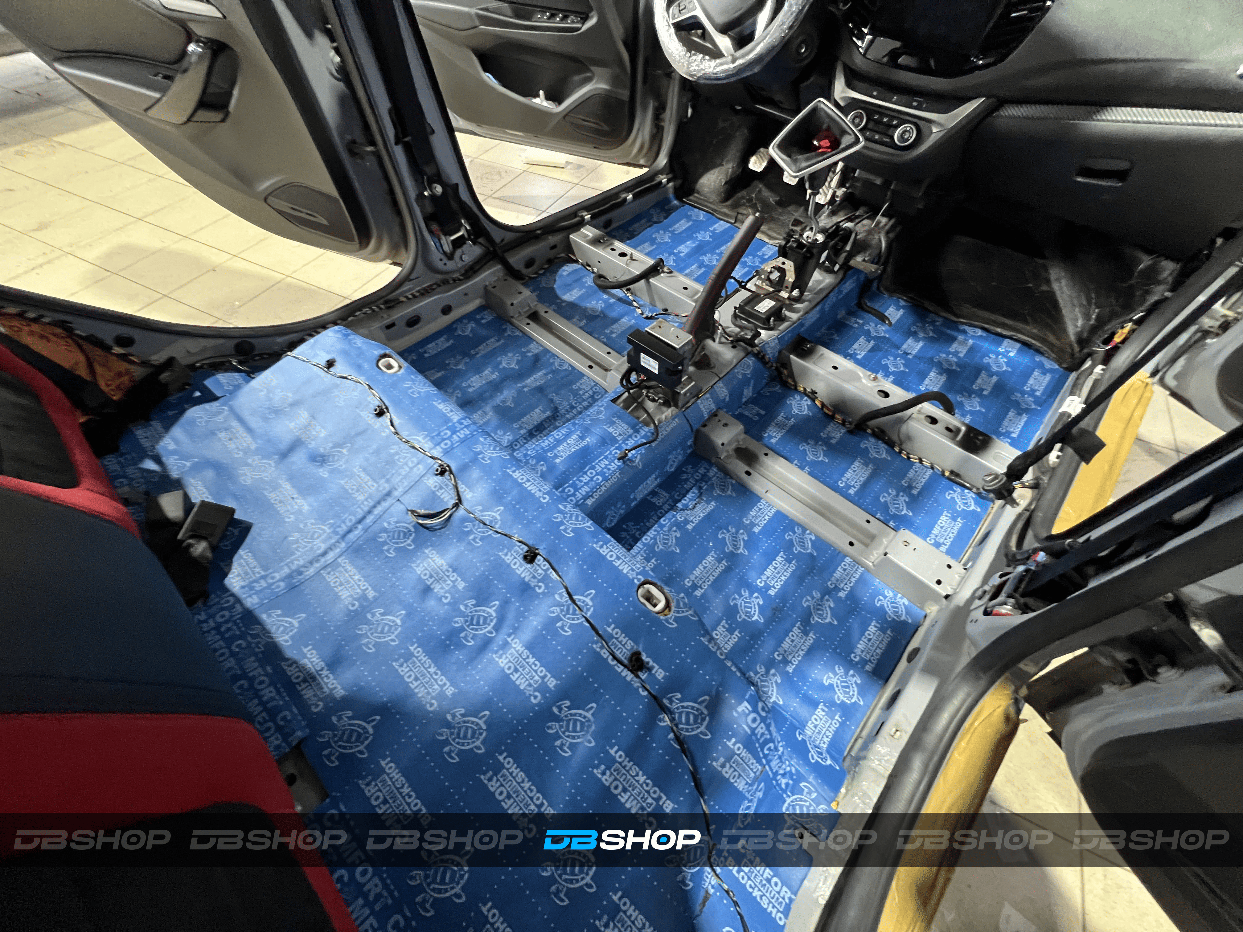 Вторым слоем на дно салона и багажник уложили Comfort Mat Premium Blockshot, а на выступающие части над колесными арками – Comfort Mat Raptor. Для герметизации швов и стыков мы применили контурную ленту, подобранную в тон изоляции, что повышает надежность и придает аккуратный вид, даже скрытый под ковровым покрытием.