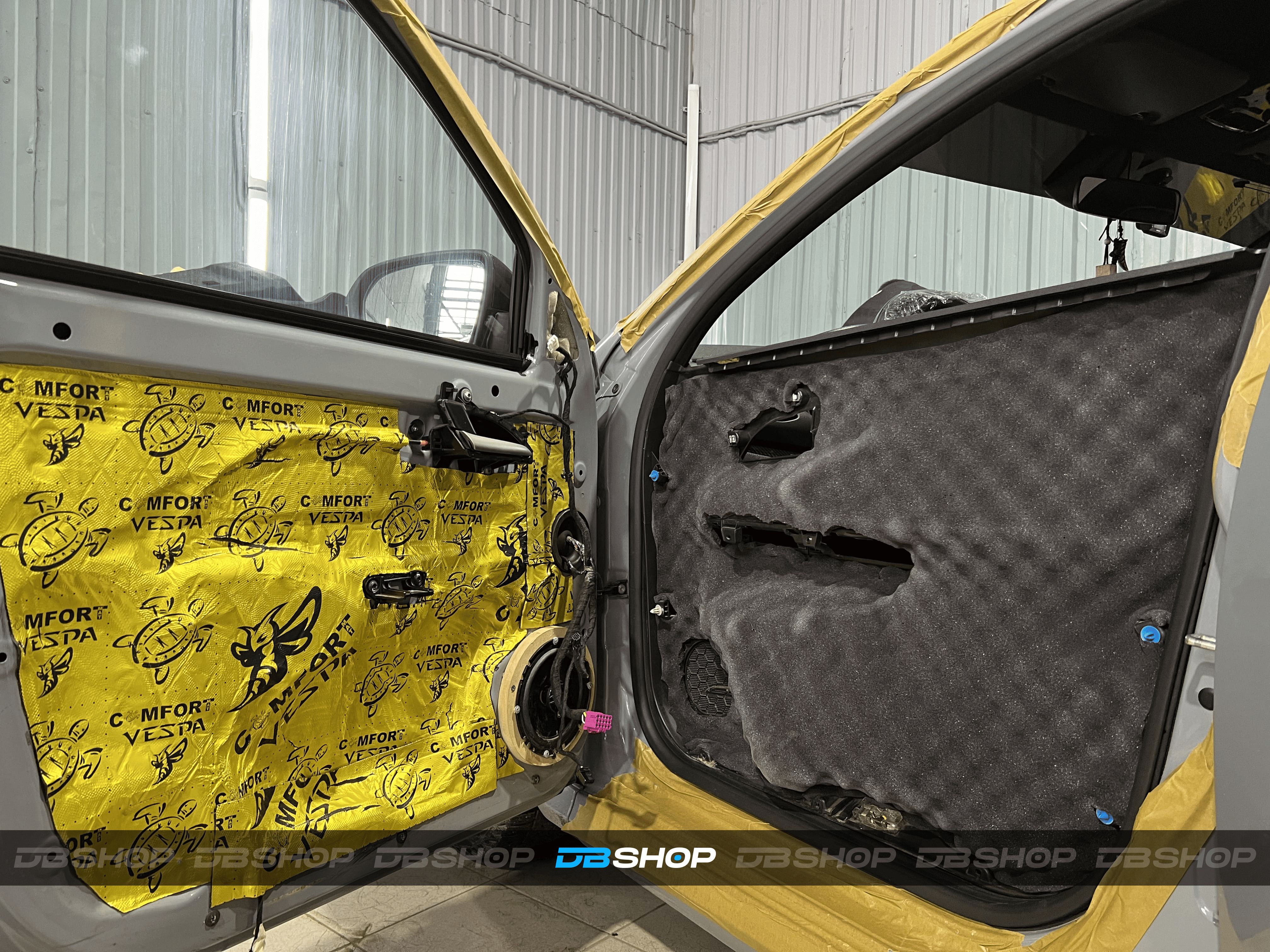 На двери и каркас двери нанесли виброизоляцию Comfort Mat Vespa и шумопоглощающие утолщенные волны Comfort Mat Тишина Volna, идеально вырезанные по размеру. Дверь багажника получила аналогичную обработку.